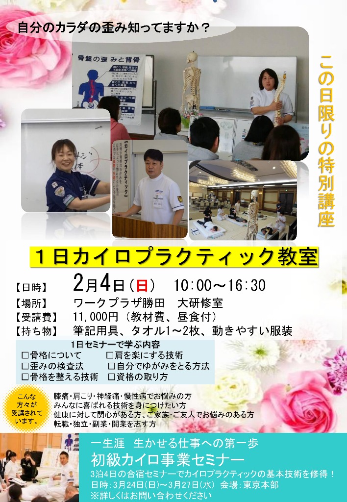 来月2/4(日)はカイロプラクティックの特別講座があります✨