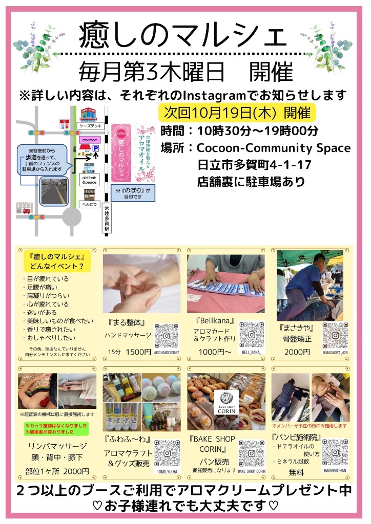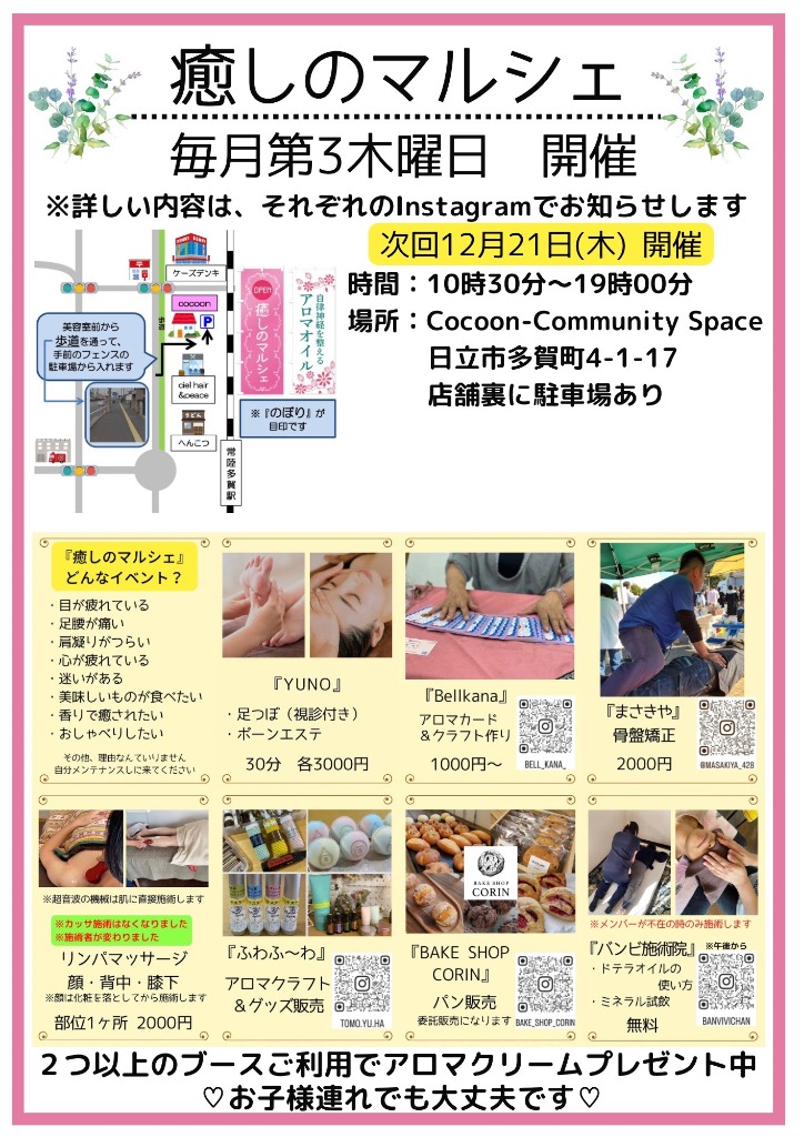 今年最後の癒しのマルシェに参加してカラダのメンテンナンスの体験をしてみましょう♪